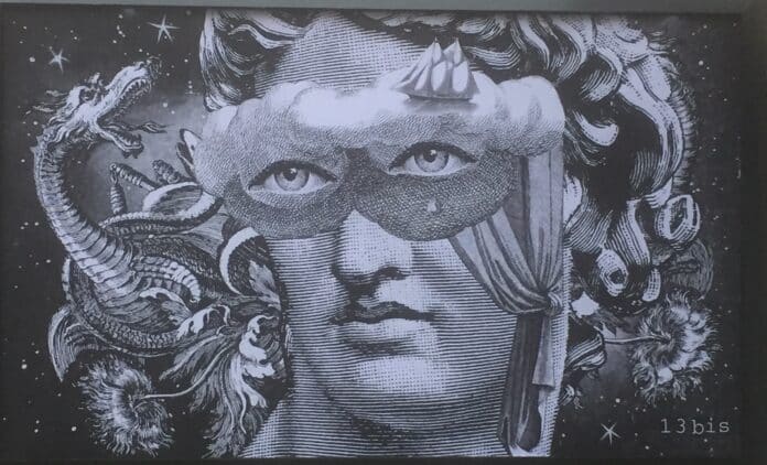 « Vive la culture déconfinée », le message de Treize Bis sur les réseaux sociaux met du baume au cœur : Nouvelle création, nouvel univers pour le M.U.R de Rennes. C’est un ciel constellé d’étoiles, habité par un visage de statue grecque masqué, encerclé de dragons, qui habille la rue Vasselot en ce début de mois de février. Aux commandes de cette nouvelle création ? Le graffeur parisien 13 Bis dont la superposition de collages crée une composition riche à l’univers fantastique. L’artiste semble piocher ses influences dans le monde de gravure, de l’art et l’onirisme des mythologies. En plongeant son regard dans celui masqué de nuages, ce travail ne peut qu’appeller à la rêverie.