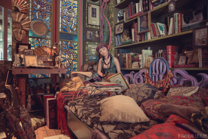Le silence règne en maître dans la bibliothèque des Champs Libres où étudiants, chercheurs et amoureux du livre cherchent leur bonheur dans les rayons, bouquinent ou travaillent studieusement. Mais une autre raison nous amène dans ce lieu baigné d’une lumière naturelle. Quand les portes de l’ascenseur s’ouvrent au sixième et dernier étage, au pôle « Patrimoine », il suffit de suivre les indications et, rapidement, vous découvrirez un univers livresque débordant d’excentricité et de créativité. Observer la bibliothèque d’un particulier, c’est un peu comme découvrir la façon de penser de son propriétaire. Toute bibliothèque est une façon de percevoir la littérature, le reflet de valeurs et de centres d’intérêt. Entrer dans celle d’Henri Pollès, par l’intermédiaire de la reconstitution de sa maison-musée, c’est pénétrer au cœur d’une passion jamais essoufflée. En témoignent le mur d’ouvrages reliés du XVIIIe au XXe siècle qui fait face au public dès l’entrée, et les livres qui remplissent, du sol au plafond, chaque pièce reconstituée.