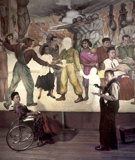 Frida Kahlo posant dans un fauteuil roulant devant « Cauchemar de guerre, rêve de paix » de son mari Diego Riviera en 1952. (Photo : Juan Guzman)
