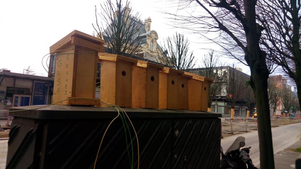Nous avons décidé de créer des nichoirs pour adresser un message symbolique à la mairie : « Nous, nous pallions à l’érosion de la biodiversité ! » Il s’agit donc de nichoirs construits grâce à du bois récolté à la Belle Déchette (une recyclerie à Rennes, située 2 rue du Pré du bois). Si les 12 nichoirs ont été installés le 25 janvier 2020, ce n’est pas anodin ! Le 25 janvier est la journée nationale du comptage des oiseaux. Heureusement, depuis, la mairie a enlevé les filets.