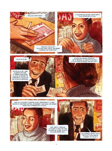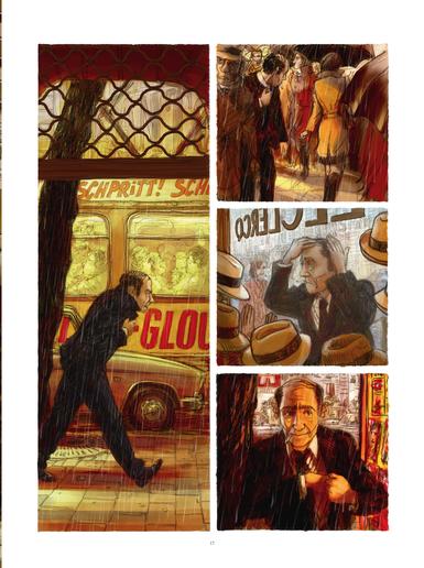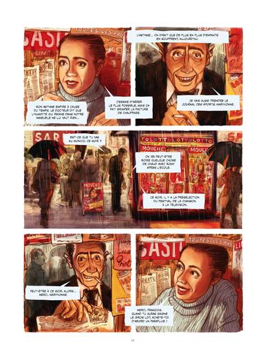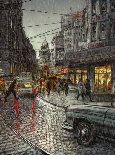 C’est le dessin magistral qui identifie d’abord le talent. Il suffit de feuilleter l’album, le geste premier d’un amateur de Bd, pour être séduit immédiatement par des doubles-pages éblouissantes. L’album est sombre, dans son récit comme dans ses images. Il pleut tout au long des 142 pages, sans arrêt, sans discontinuer, une pluie drue qui rend les rues d’un Bruxelles recomposé au temps des DS et des Simca 1000, fantomatiques mais présentes comme un personnage essentiel. Les cases sont allumées de l’intérieur par quelques couleurs récurrentes. Le rouge, le même que le manteau de Béatrice, éclaire les scènes, le rouge et le jaune des phares des voitures, des enseignes lumineuses, omniprésentes. « Schpritt », « Mouche télé », « Glou-glou » ou encore « Schtinck » balisent, comme des onomatopées dans des pages silencieuses et rêveuses, la balade bruxelloise de François, homme proche de la retraite, qui mène une vie routinière de livreur chez une blanchisserie et partage sa vie entre son métier, une petite chambre et quelques bières chez Monica, son bistrot favori.