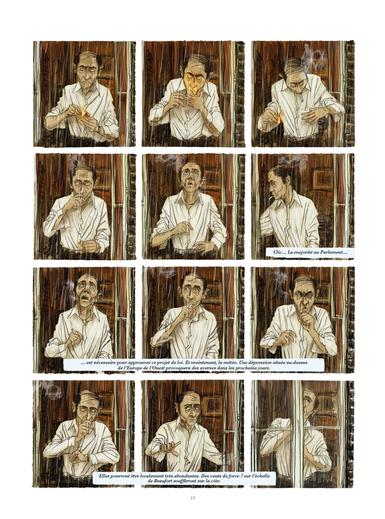 Joris Mertens a été scénariste, coloriste et dessinateur belge pour le cinéma et la télévision, et ce passé professionnel se retrouve dans des plans scénarisés comme au Grand Rex : douze cases pour déguster une cigarette du matin ou pour une scène dialogue dans un fast-food, double page sur un décor urbain tétanisé par les embouteillages, plongée, contre plongée, toute la grammaire cinématographique est utilisée.