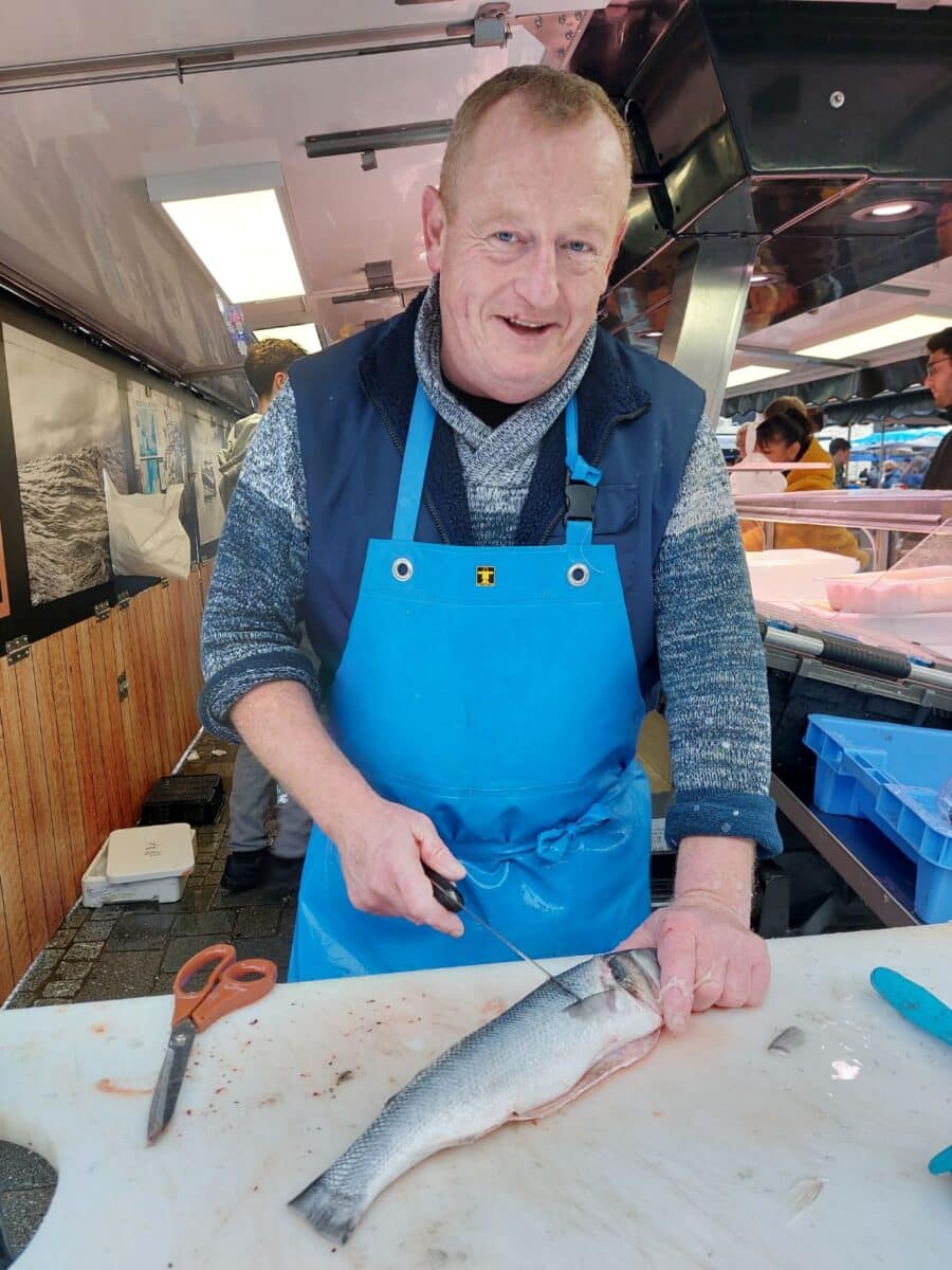 À quelques pas de ce stand, nous tombons sur Christophe, de la Poissonnerie La Pêche Côtière, en pleine découpe d’un bar. Aurait-il une recette pour les fêtes ?« Pour Noël, je conseille de préparer un bar en croûte de sel. J’en ai justement un sous la main ! ». Pour cette recette délicate et parfumée, il vous faudra mélanger du sel gros, environ 1,5 kg pour un bar, avec des herbes de Provence. « Je rajoute aussi du blanc d’oeuf pour obtenir une croûte bien craquante à la cuisson », ajoute Christophe. Dans un bar évidé, disposer une julienne de légumes et du thym dans son ventre et le recouvrir de la préparation de sel gros. Enfournez 25 à 30 min à 200°C, laissez reposer 5 minutes puis cassez la croûte… de sel ! « Il n’y a pas besoin de sauce, le goût du poisson se suffit à lui même », ajoute t-il. Accompagné de pommes de terre Grenailles, c’est le plat idéal à poser au milieu de la table et à partager en famille ou entre amis.