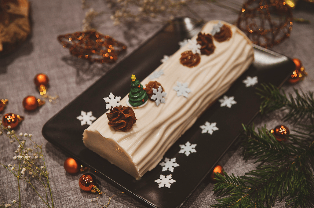 Le marché touche à sa fin, et nous terminons par un dernier dessert pour terminer le repas en beauté : une bûche vanille, poire et caramel. Plus technique, mais très gourmande, nous étions obligés de vous donner cette recette végane qui régalera vos invités.
