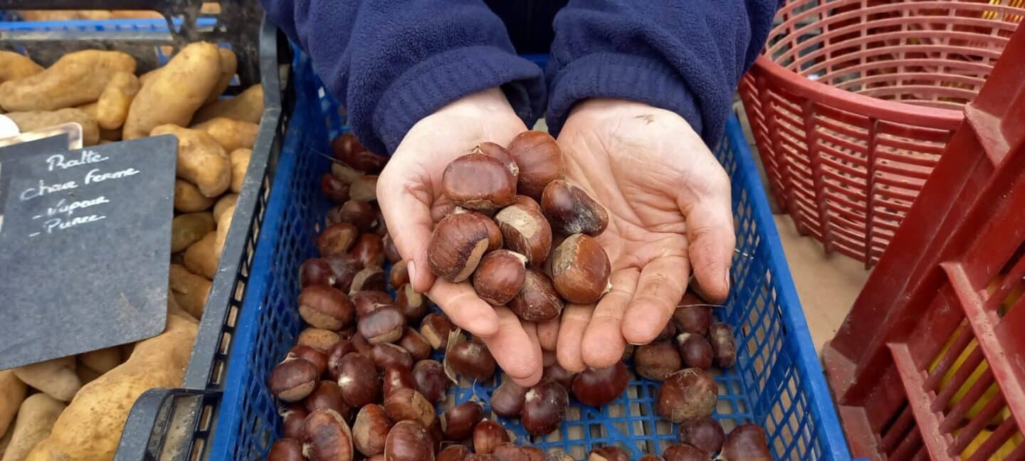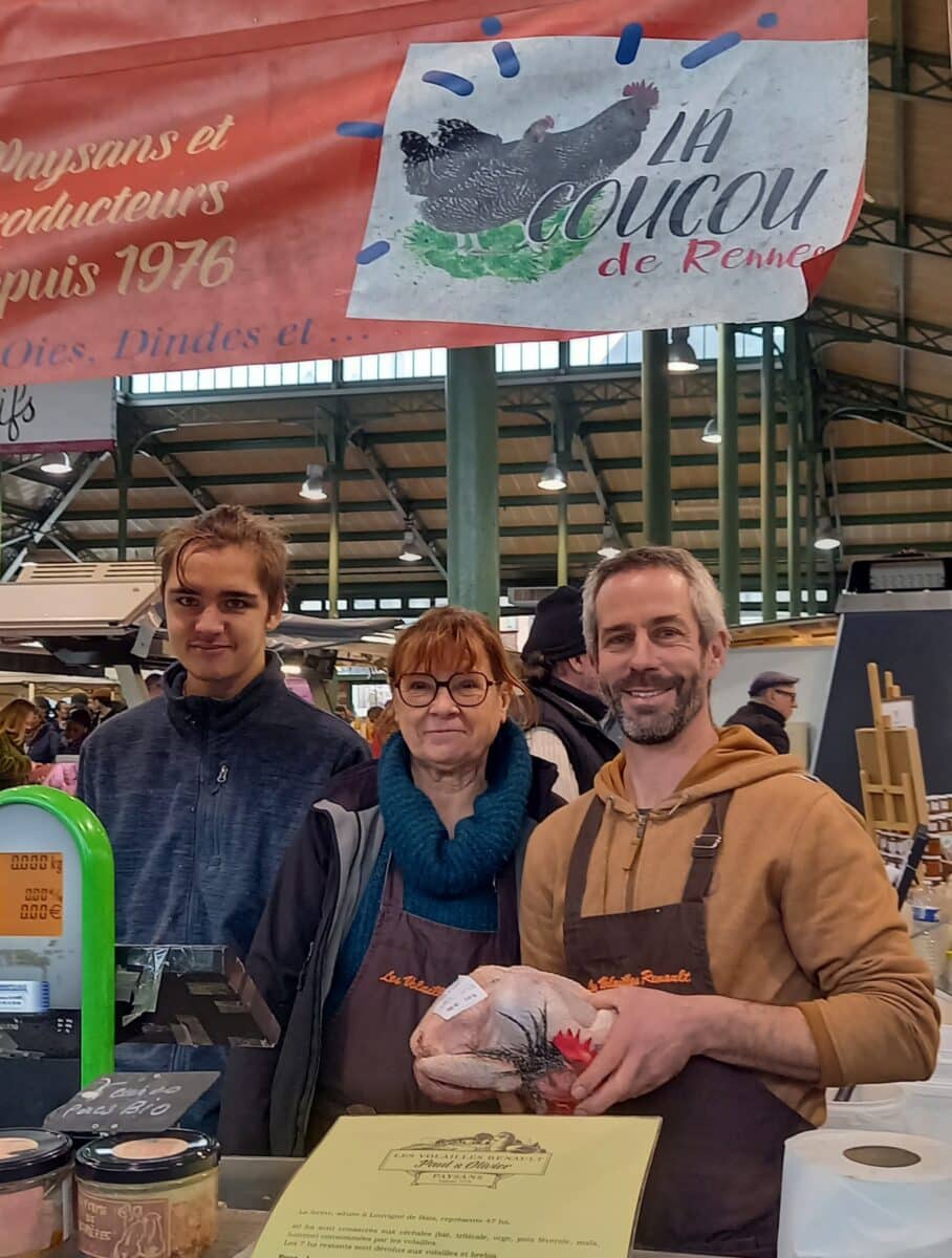 Nous continuons notre tour du marché en s’engouffrant dans les halles Martenot. Nous tombons nez à nez avec Olivier, producteur de coucous de Rennes et fervent défenseur de l’agriculture paysanne à Louvigné-de-Bais, en Ille-et-Vilaine. La chair tendre au goût de noisette confère à cette ancienne race locale le statut de reine des volailles. « Vous mettez votre coucou entière dans une cocotte avec un peu d’eau. Pour une coucou de 2 kilos, vous enfournez à 180°C pendant deux heures sans matière grasse », explique Olivier. La volaille va perdre son gras pendant la cuisson et donner un moelleux incomparable. À servir avec une purée de panais, vous pouvez aussi cuire les légumes de saison de votre choix directement dans la cocotte. Alternative à la classique dinde aux marrons de Noel, la coucou de Rennes est un gage de qualité : race à croissance lente, ce poulet est élevé minimum 130 jours et dispose de 10m2 minimum de parcours herbeux. Il est aussi nourri de façon traditionnelle avec une alimentation végétale et minérale, et finit au « petit lait », ce qui lui ajoute une saveur unique. Sauvée du déclin dans les années 1990, la filière est une nouvelle fois menacée par les différentes crises qui se sont succédé, comme la grippe aviaire ou le covid. « Nous sommes une poignée de producteurs de coucous sur l’ensemble du bassin Rennais, et espérons compter sur nos clients pour pérenniser l’activité » ajoute Olivier.
