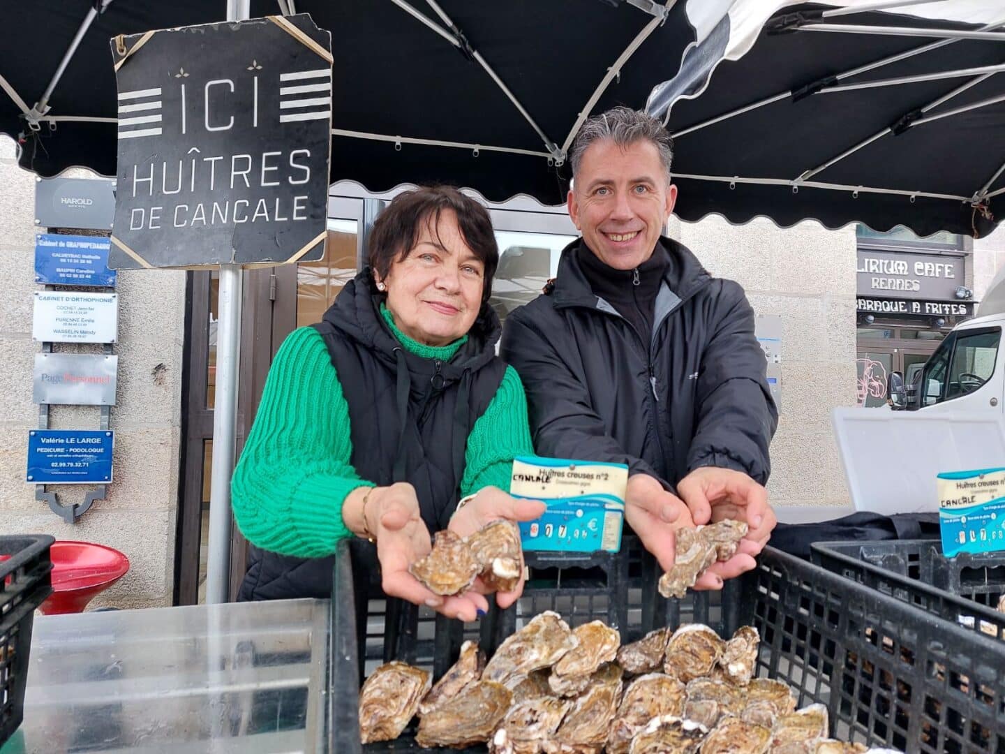 Nous arrivons sur la place des Lices du côté des halles aux poissons. Les stands d’huîtres de Cancale nous font de l’œil… et quoi de mieux que des crustacés pour commencer notre repas ! On se laisse tenter par les bons conseils de Marie et Bruno de la maison ostréicole Cancalaise Bravig (qui veut dire « joyau » en breton). « Pour l’apéritif, nous proposons des huîtres creuses numéro 4, très petites mais au goût délicat et la texture tendre. Le meilleur étant de les manger nature ou avec un peu de citron, vous pouvez néanmoins surprendre vos convives cette année avec des huîtres chaudes », explique Marie. « Pour cette recette, il faut des huîtres creuses numéro 2, les faire cuire à la casserole puis les servir avec un beurre blanc et un julienne de légume juste snackée », ajoute Bruno.