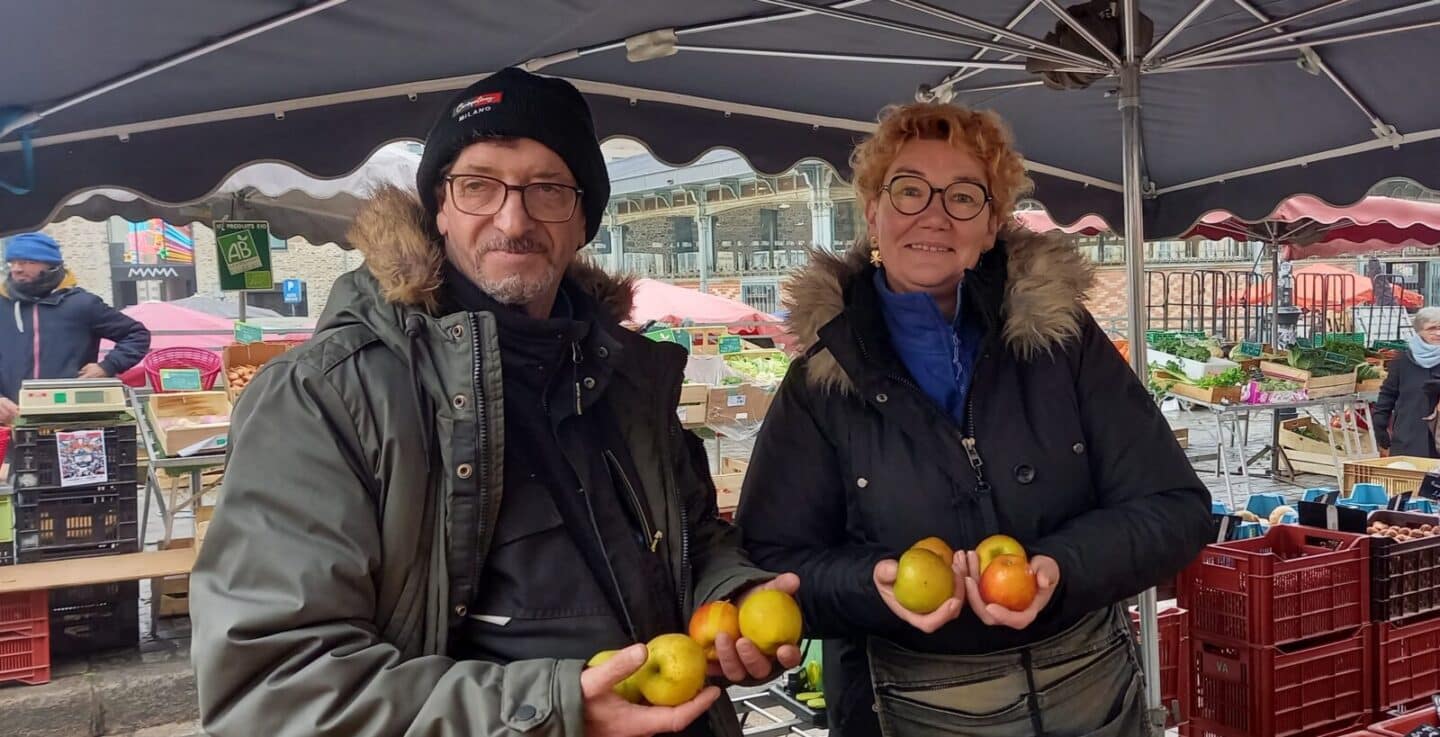 Nous sortons des halles et déambulons parmi les étals de fruits et légumes. Nous nous arrêtons au stand de Laurent et Karine, maraîchers à Soucelles près d’Angers. Leur recette : des pommes farcies aux raisins secs, miel et épices de Noel. « Avec nos pommes Pilot bien sûr ! Croquante et juteuse, c’est une variété qui se tient à la cuisson et apporte une belle acidité pour un dessert ou un accompagnement salé à Noel ».