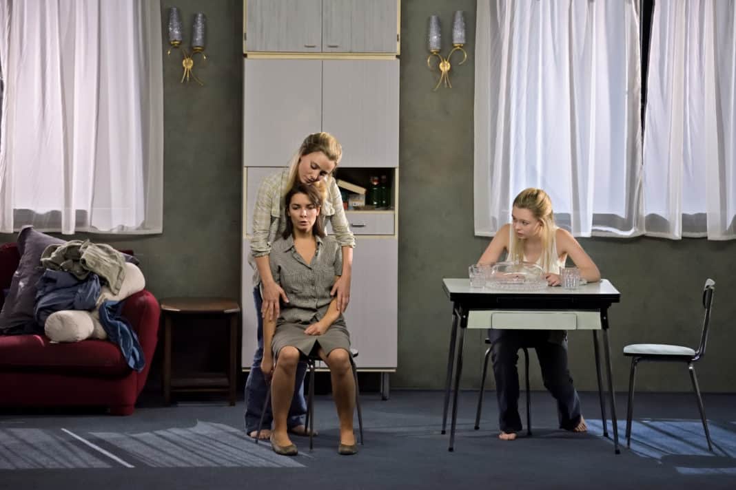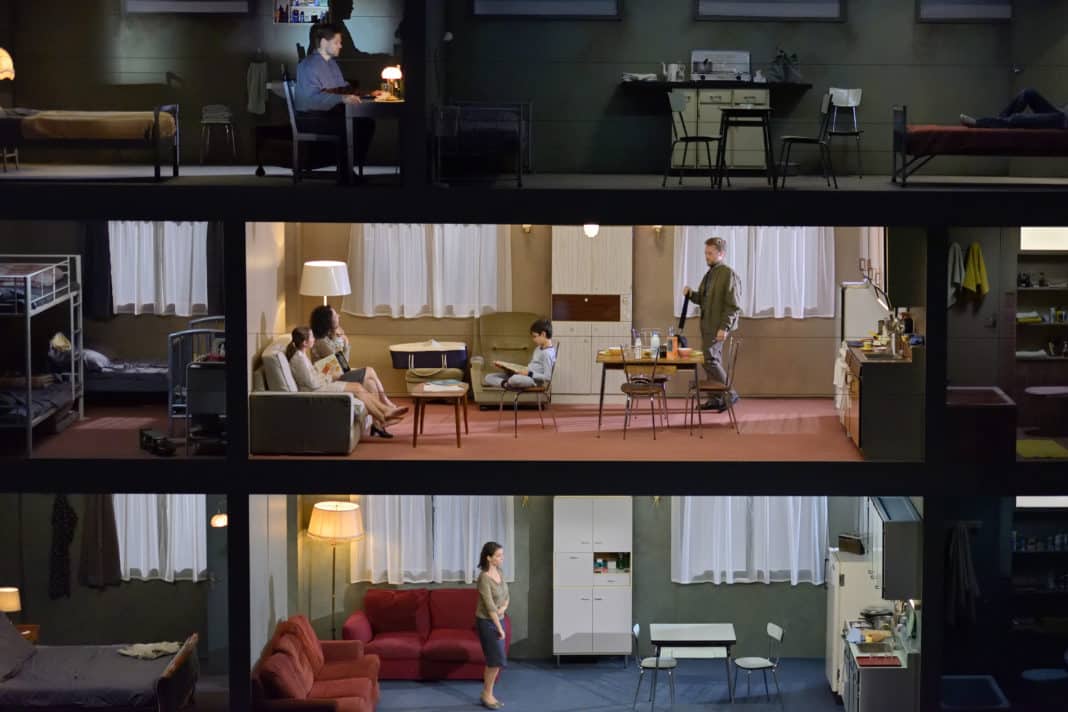 Point n’est besoin d’être grand clerc pour comprendre ce qui va se passer malgré les quatorze ans de la jeune fille, mais c’est anecdotique. La mise en scène donne vie à ce drame de manière très visuelle et le décor assez incroyable créé par Eric Soyer nous met face à trois étages d’un immeuble dont les murs absents nous laissent apercevoir la vie qui se déroule à l’intérieur. Les pièces s’allument et s’éteignent comme dans la réalité, nous incitant à suivre ce qui s’y déroule, et nous nous trouvons en situation d’être spectateurs et aussi un peu voyeurs.