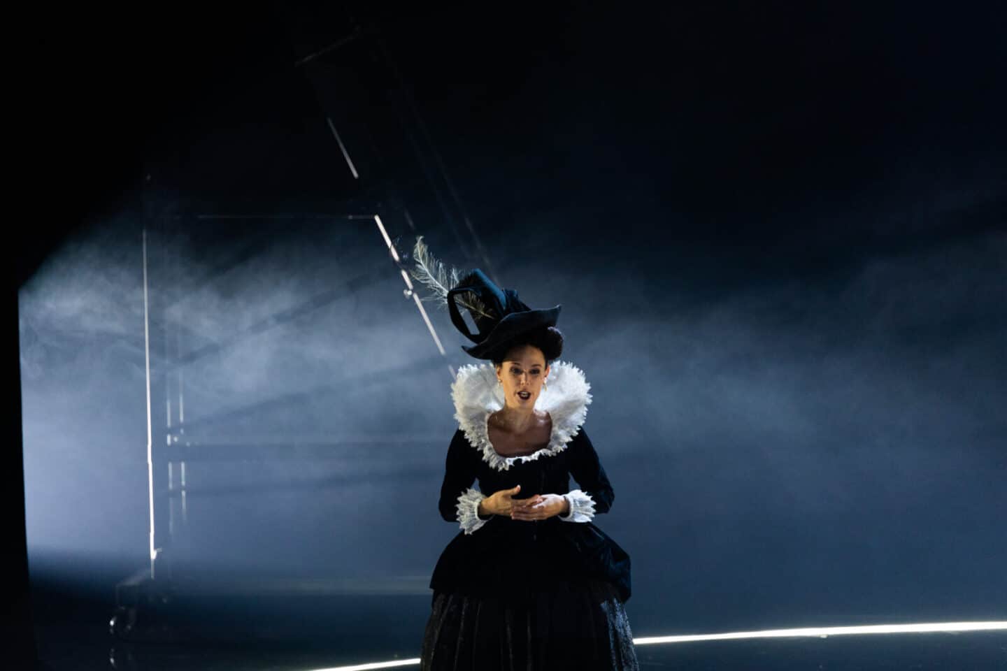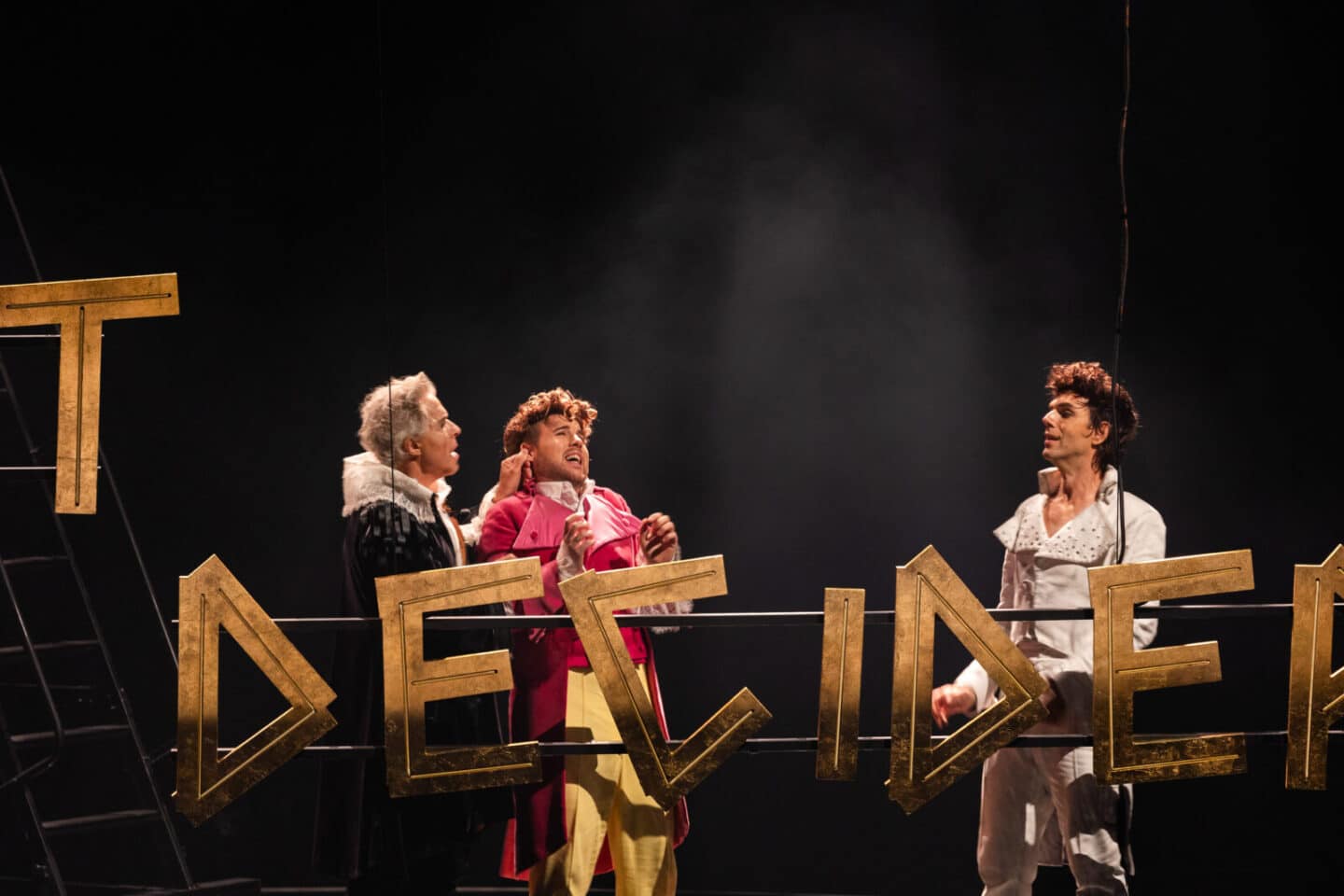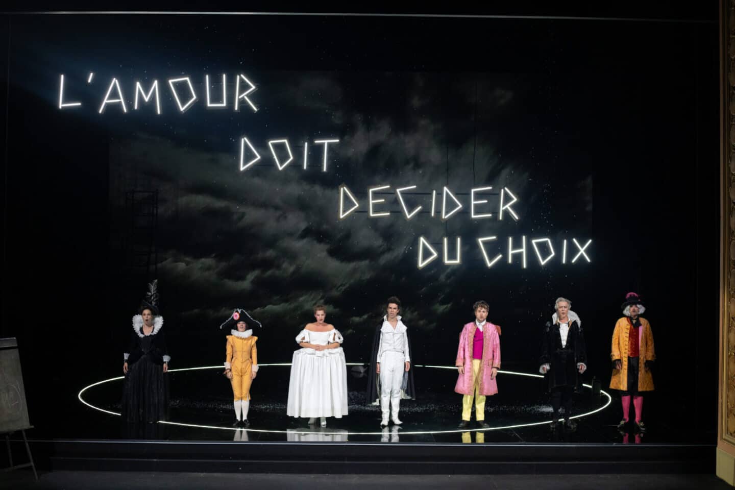 Loin d’une agressivité de mauvais aloi, c’est avec humour que le sujet est traité. La présence sur scène d’un tableau noir sur lequel est notée d’un trait de craie chaque remarque sexiste est plutôt divertissante. L’exercice invite plus la réflexion apaisée qu’à la réaction agacée. Voilà le talent du metteur en scène Jean Lacornerie, lequel, par ailleurs, exploite avec adresse tous les artifices d’un opéra. Le grand plateau tournant qui occupe la majeure partie de la surface de la scène permet aux intervenants de se livrer à un véritable ballet qui donne à l’intrigue une réelle consistance. Même remarque pour les lumières de Kevin Briard dont la modernité confère un véritable vitalité à la scénographie. Un tout petit bémol pour les costumes de Marion Bénages qui ne nous ont pas totalement convaincus ; si l’inspiration de la comedia del arte est réelle, quelques éléments de couleur nous ont laissé circonspects.