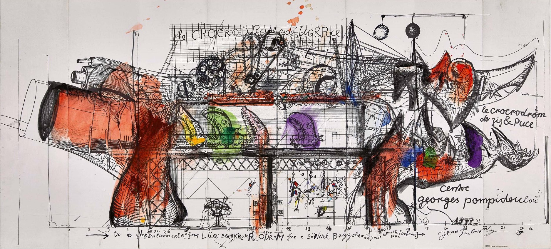 Pour l’inauguration du Centre Georges Pompidou à Paris, en 1977, Pontus Hulten invite Jean Tinguely à concevoir une grande sculpture. C’est ainsi que voit le jour le Crocrodrome, réalisé en partenariat avec le sculpteur suisse Bernhard Luginbühl (1929-2011)