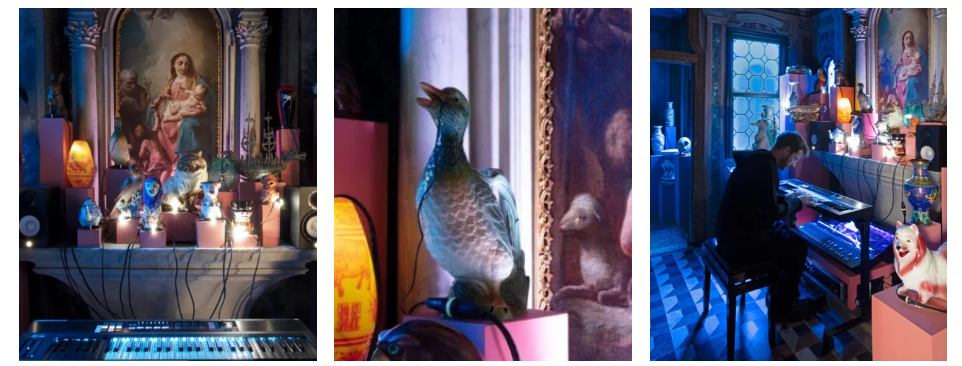 Oliver Beer réalise aussi des expériences de mise en son d’objets : installé devant un petit harmonium, il multiple des gammes faisant résonner divers objets disposés devant lui, comme une théière ou un canard en porcelaine…