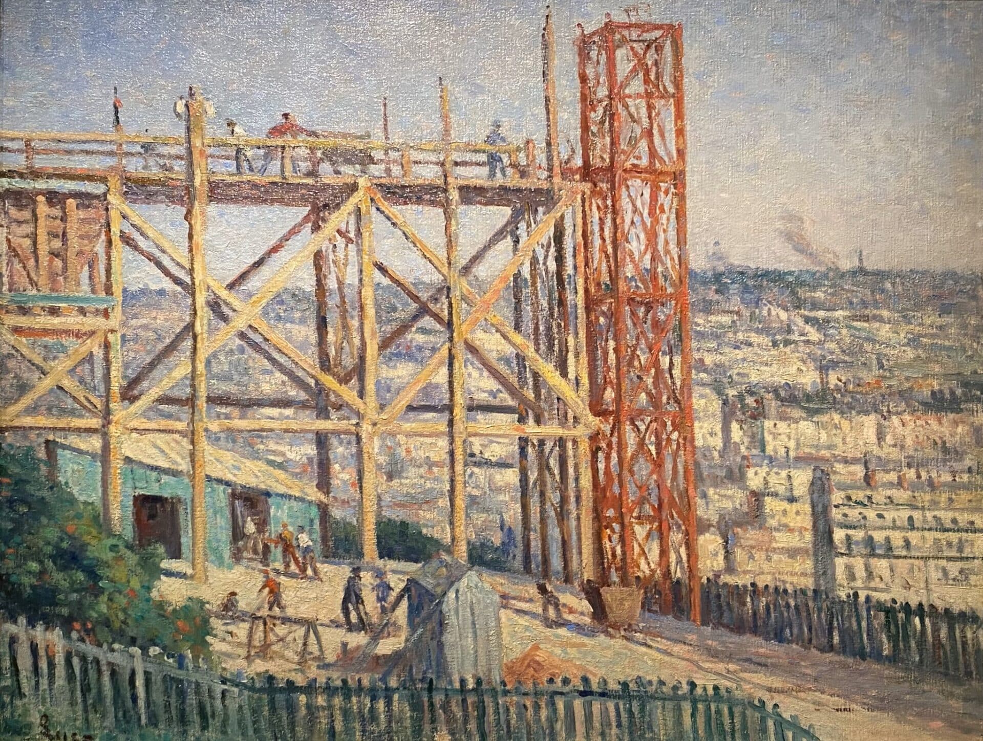 À l’orée du XXe siècle, Paris est en chantier. Luce la peint comme on chronique une mutation organique : ouvriers, grues, échafaudages, boue, fer, ciel zébré de vapeur. Il magnifie l’effort anonyme des bâtisseurs et trouve, dans la verticalité des formes haussmanniennes, une nouvelle géométrie picturale. Ses scènes urbaines — la rue des Abbesses, le quai Saint-Michel, les bouquinistes — capturent la trépidation sociale autant que l’élégance du quotidien.