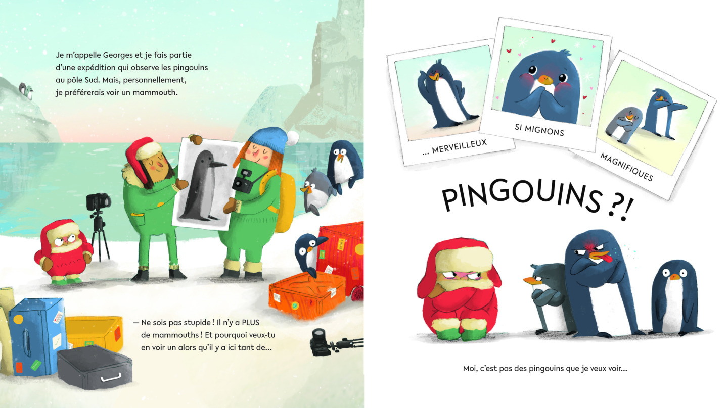 Georges fait partie d’une expédition qui observe les pingouins au pôle Sud. Mais, lui, il est là pour voir un mammouth. Les adultes ne l’écoutent qu’à moitié, ce qui le frustre passablement. Alors quand il voit véritablement un mammouth et qu’il file prévenir toute la banquise sans jamais être pris au sérieux, cela l’ÉNERVE PROFONDÉMENT ! Cet hiver, préparez-vous à une rencontre de taille !
