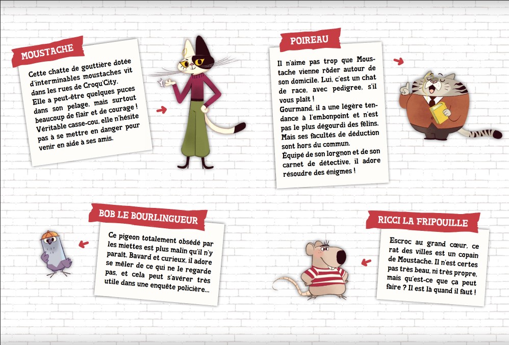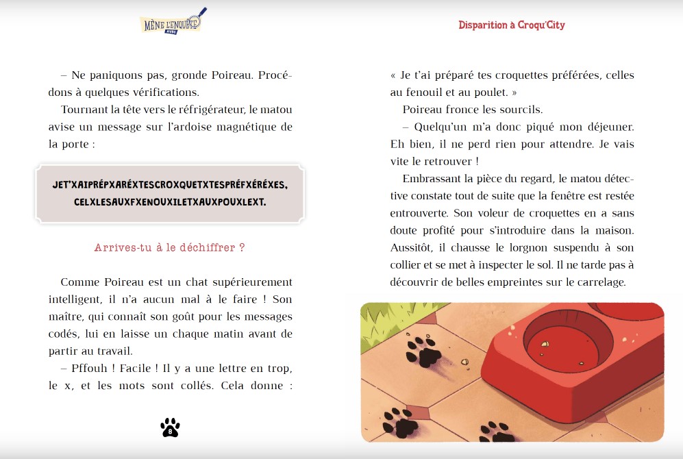 Malheur à Croqu’City ! Le chien Bichon a disparu. Ce n’est pas dans ses habitudes de fuguer, remarque Poireau, chat distingué, quoiqu’un peu empoté, qui habite la maison d’à côté. Lui est-il arrivé quelque chose ? Heureusement, Poireau est détective à ses heures perdues. Il n’est d’ailleurs pas le seul… Moustache est aussi téméraire que ses moustaches sont longues, et elle compte bien mettre la patte à l’enquête. Ensemble, sauront-ils retrouver la trace de Bichon ?