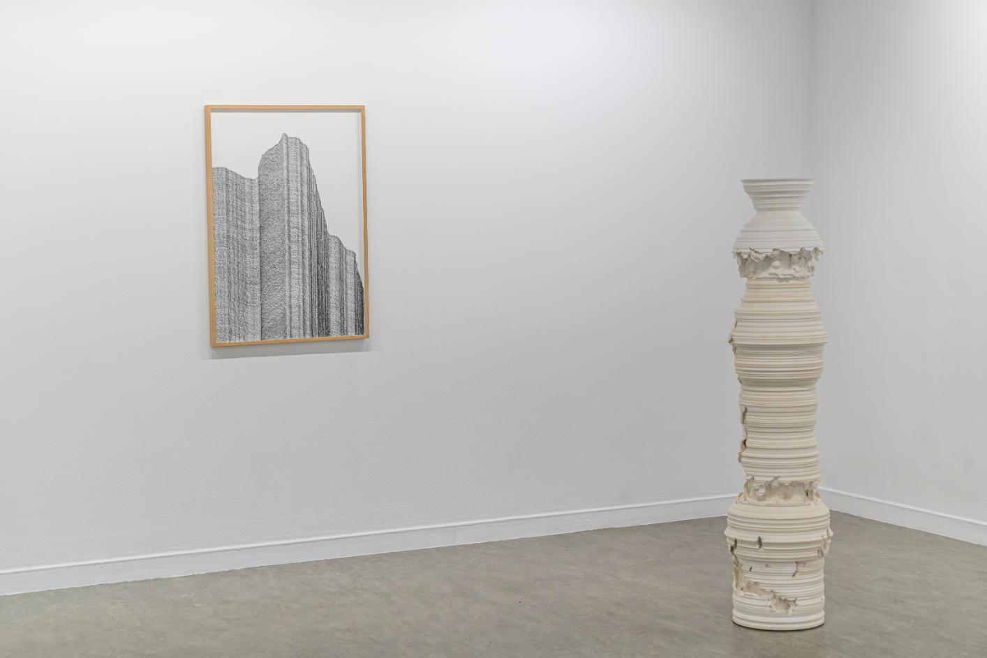 Au cœur de la démarche, il y a le traînage, une technique issue des pratiques des staffeurs ornemanistes. Guidée par un traîneau équipé du calibre en zinc, la forme se construit par ajouts successifs de plâtre. Le geste devient répétitif, presque mécanisé, mais il demeure dépendant du corps, de l’attention et des micro-variations du faire. Les volumes qui en résultent convoquent un vocabulaire classique, la colonne notamment, mais ils en déplacent les codes, car ils laissent apparaître la fragilité, l’irrégularité et la coupure comme des principes actifs.