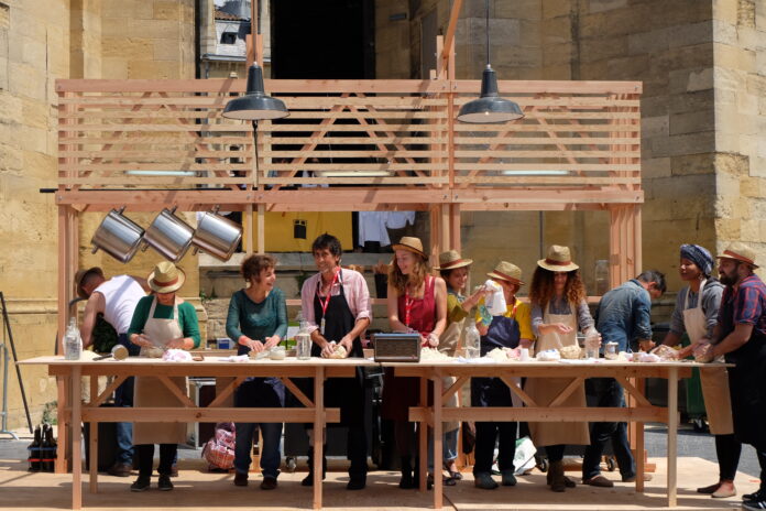 Guénolé Jézéquel : On constitue un groupe de 14 habitants. On travaille en amont avec eux pendant deux jours. On se donne des rôles, on crée une équipe. La journée s’articule en trois temps. D’abord, on fait les boules de pâtes : on est aligné à pétrir à partir de la farine et de l’eau. Après, on amène les boules à reposer, on les déplace chez un commerçant ou un habitant. Puis on les récupère pour faire des tagliatelles. Avec un beau geste, on les transforme, tout simplement. Sur de la musique italienne : Adriano Celentano et Dalida, notamment. La cuisine grossit donc au fur et à mesure. Ensuite, on doit se séparer en deux groupes, l’un en cuisine, l’autre en salle. On se fait beau. Le jeu commence : nous n’avons pas de tables. Les gens doivent en ramener : table basse ou à repasser, pourquoi pas ? On constitue un banquet le plus maladroit possible. La règle du jeu, c’est un chef d’équipe pour une table de dix personnes. Donc, 40 chefs de table. Le banquet est gratuit et ouvert à tous. Sauf les boissons, à la buvette.