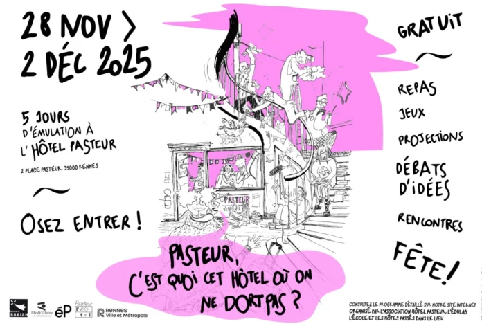 À la question « Pasteur, c’est quoi cet hôtel où on ne dort pas ? », l’équipe de l’Hôtel Pasteur répond par les actes. Du vendredi 28 novembre au mardi 2 décembre 2025, le bâtiment emblématique de la place Pasteur à Rennes se transforme en laboratoire d’hospitalité, de savoirs partagés et d’expérimentations démocratiques. Cinq jours d’émulation ouverts à toutes et tous : ateliers, projections, chantiers participatifs, performances, jeux, débats et assemblée générale…