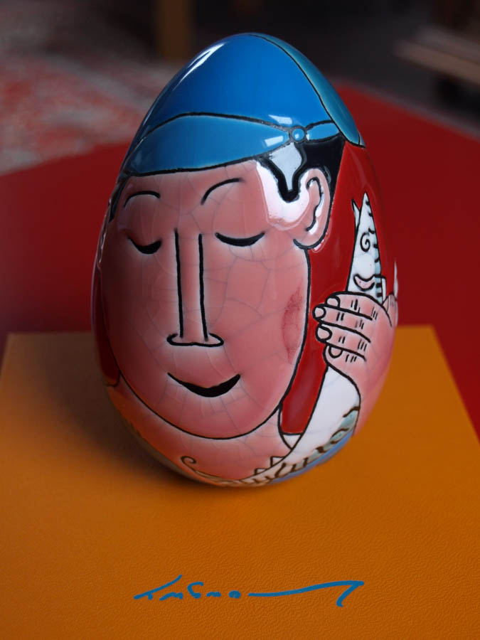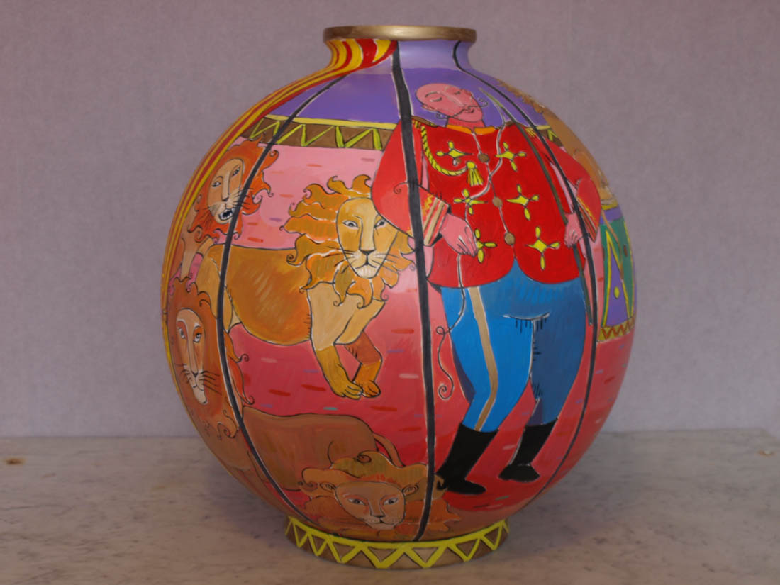 Il affectionne particulièrement les formes de vases héritées de l’Art déco, qu’on lui confie pour les décorer. Sous certaines pièces, il ajoute des textes qu’il écrit en relation avec le dessin. Des céramiques « parlantes », au sens le plus littéral, mais aussi au sens sensible, comme si l’objet devenait récit.