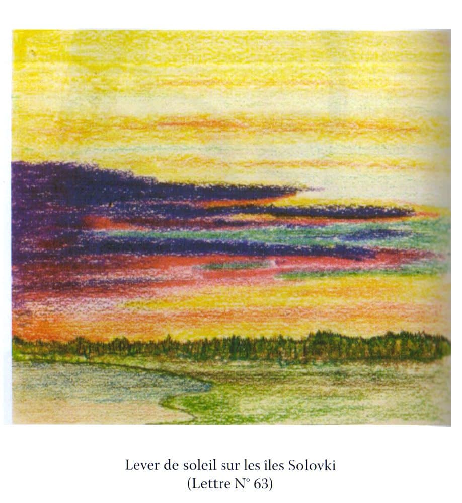 Ces Lettres de Solovki offrent en outre une multitude de dessins exécutée par Paul Florensky, souvent avec les moyens « du bord ». Ce sont le plus souvent des illustrations, des planches botaniques. Paradoxalement, les techniques artisanales qu’il doit inventer pour réaliser ces dessins leur confèrent une dimension authentiquement artistique. Le plus émouvant demeure un pastel aux splendides couleurs incendiaires représentant un lever de soleil sur les îles Solovki. Cri silencieux de victoire de l’âme face aux délires tortionnaires de ceux qui tout en prétendant la nier voulaient la mécaniser. Dans la lettre n°81 des 23 et 24 novembre 1936, l’auteur écrit cette profession de foi qui résonne comme une condamnation de ceux qui voulaient le conduire au bonheur forcé :