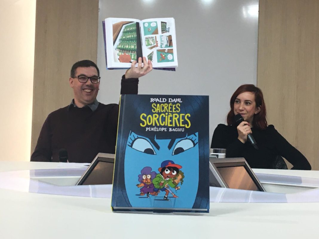 Ma version de Sacrées Sorcières est quand même très différente de celle de Roald Dahl. Rien que le fait d’inscrire le récit au cœur d’une nouvelle époque a impliqué de nombreux changements. Mon héros est différent et n’a plus les mêmes préoccupations que le héros du roman en 1983. Je pense qu’aujourd’hui, un petit garçon de 8 ans est beaucoup moins insouciant qu’un enfant de 8 ans au début des années 80. Pendant toute la création de Sacrées Sorcières, j’ étais en communication avec le petit fils de Roald Dahl. Jusqu’à la dernière minute, il avait le droit de refuser la sortie de ma BD. Mais il s’est montré réceptif aux modifications que je souhaitais apporter. Puisque la plume de Roald Dahl est vraiment exceptionnelle, je n’ai pas touché à la trame, mais par exemple, dans ma BD, j’ai ajouté une petite fille qui n’existe pas du tout dans l’œuvre initiale. »
