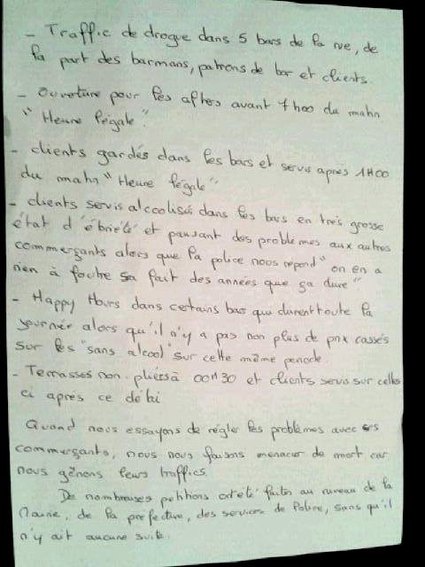 Destinée aux services de la mairie, au chef des débits de boisson, aux service des stupéfiants de la police, à l’UMIH et à Monsieur le Préfet, elle est signée en date du 8 juin et cachetée par 4 gérants de commerce, dont ceux du Barantic et du Melting Pot (les deux autres ne souhaitant pas pour l’instant être connus comme nous l’a expliqué le gérant du fameux bar breizhou). Son objet : dénoncer de possibles pratiques répréhensibles, voire franchement illégales, de tenanciers et serveurs d’autres bars de ladite rue, du genre ‘un peu de coco avec ton apéro’ ou ‘un peu de chichon avec ton saucisson’. Ambiance…