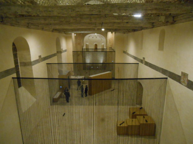 Des rideaux de fils noirs découpent l’espace en cinq parties et créent différents temps de rencontres où les corps statiques, mais en mouvement se font face et se confrontent. Cinq espaces laissent des scènes narratives et visuelles sont en train de se jouer. Chaque sculpture raconte une histoire, celle du spectateur. Au total, huit grands formats (à échelle 1) affrontent quatre plus petits sur socles. Le public, au milieu, est pris à partie et entre dans ce corps à corps. Une barrière de rideau brouille la vision du prochain espace. Il suffit alors de se rapprocher et tout devient plus clair. Un jeu de transparence savamment mise en place qui permet de partir à la découverte des différentes œuvres petit à petit. Sans oublier le jeu de silhouettes entre celle du spectateur et celle de la sculpture. Le visiteur déambule autour d’elles et en devient une parmi d’autres.