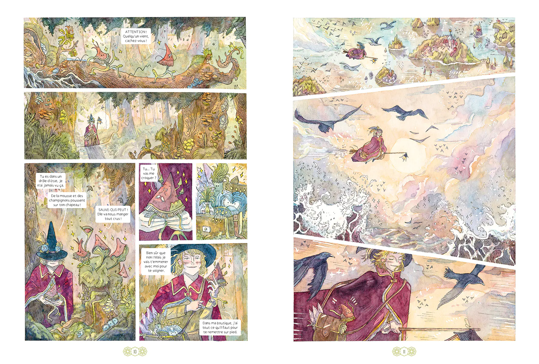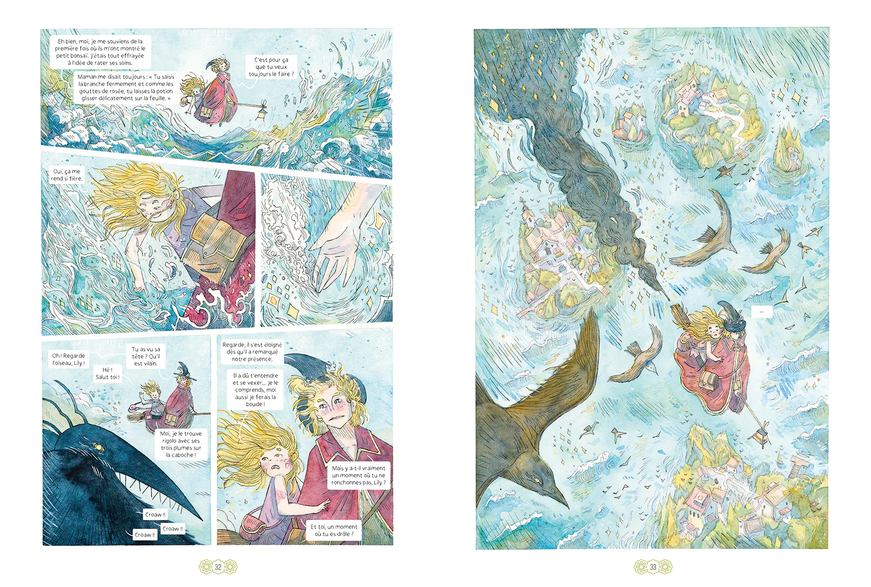 Si Lily est seule présente sur la couverture, nous rencontrons dès la première page la grande sœur, Aurore, dont les cheveux sont aussi blonds et les mèches aussi rebelles. Alors que la plus jeune est encore dans les bras de Morphée, l’aînée vole sur son balai au-dessus des îles qui composent l’archipel dans lequel elles vivent, avant d’atterrir dans une forêt où des champignons s’éveillent à son arrivée. « J’avais envie de raconter l’histoire de deux personnages, un adulte et un plus enfantin, parce que j’aime bien les premiers films Pixar comme Le Monde Némo qui s’adresse un peu à tout le monde. » La cadette, Lily, est vive et curieuse de tout, mais fait preuve de maladresses. « C’est un mélange des traits de caractères de personnes de mon entourage, je trouvais intéressant de construire un personnage qui essaie de trouver sa place. » Aurore est plus sérieuse et se désespère parfois de l’insouciance de Lily, mais l’infantilise peut-être parfois. « Ce personnage, dans sa construction, est plus lié à moi : le fait d’être adulte et d’avoir des responsabilités, de devoir gérer des choses qu’elle n’a pas voulu. »