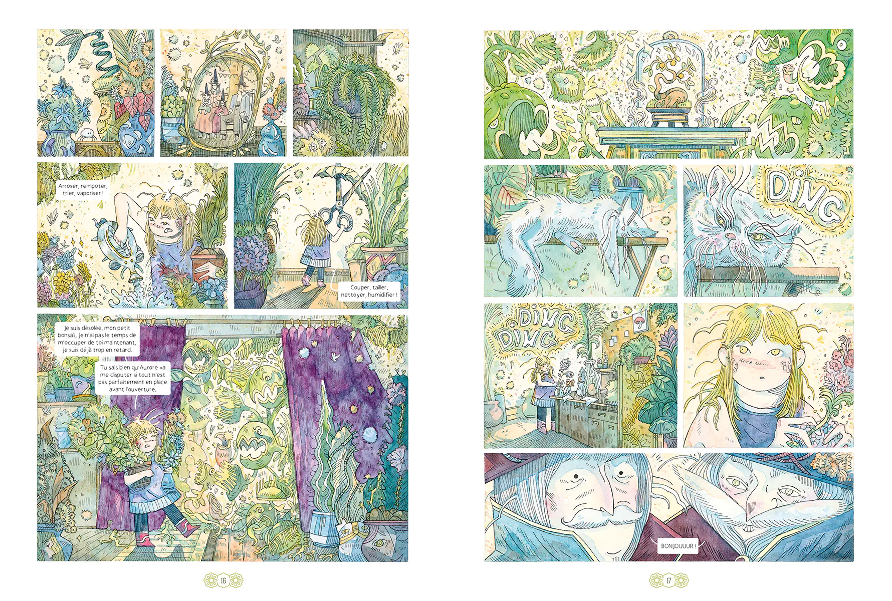 Vincent Dock nous convie à découvrir ce lieu enchanté dans des planches habitées par la douceur de l’aquarelle, et lumineuses de jour comme de nuit. Dans ce havre de paix végétal, l’ambiance est tamisée, le dessin touffu et lumineux. On a envie de chuchoter pour ne pas déranger les habitantes principales : des plantes magiques. Il crée un monde fantastique où fleurit une biodiversité sereine. « Quand on s’intéresse au sujet, on se rend compte de la diversité incroyable qui existe. L’idée était de partir de plantes réelles et de pousser plus loin le curseur pour imaginer une flore magique. » Le dessinateur a retranscrit graphiquement ses interrogations, et s’est amusé à imaginer une nouvelle nature : que donnerait une plante qui pousserait dans un oiseau ? Ou une plante qui vivrait dans un lieu perpétuellement enneigé ?
