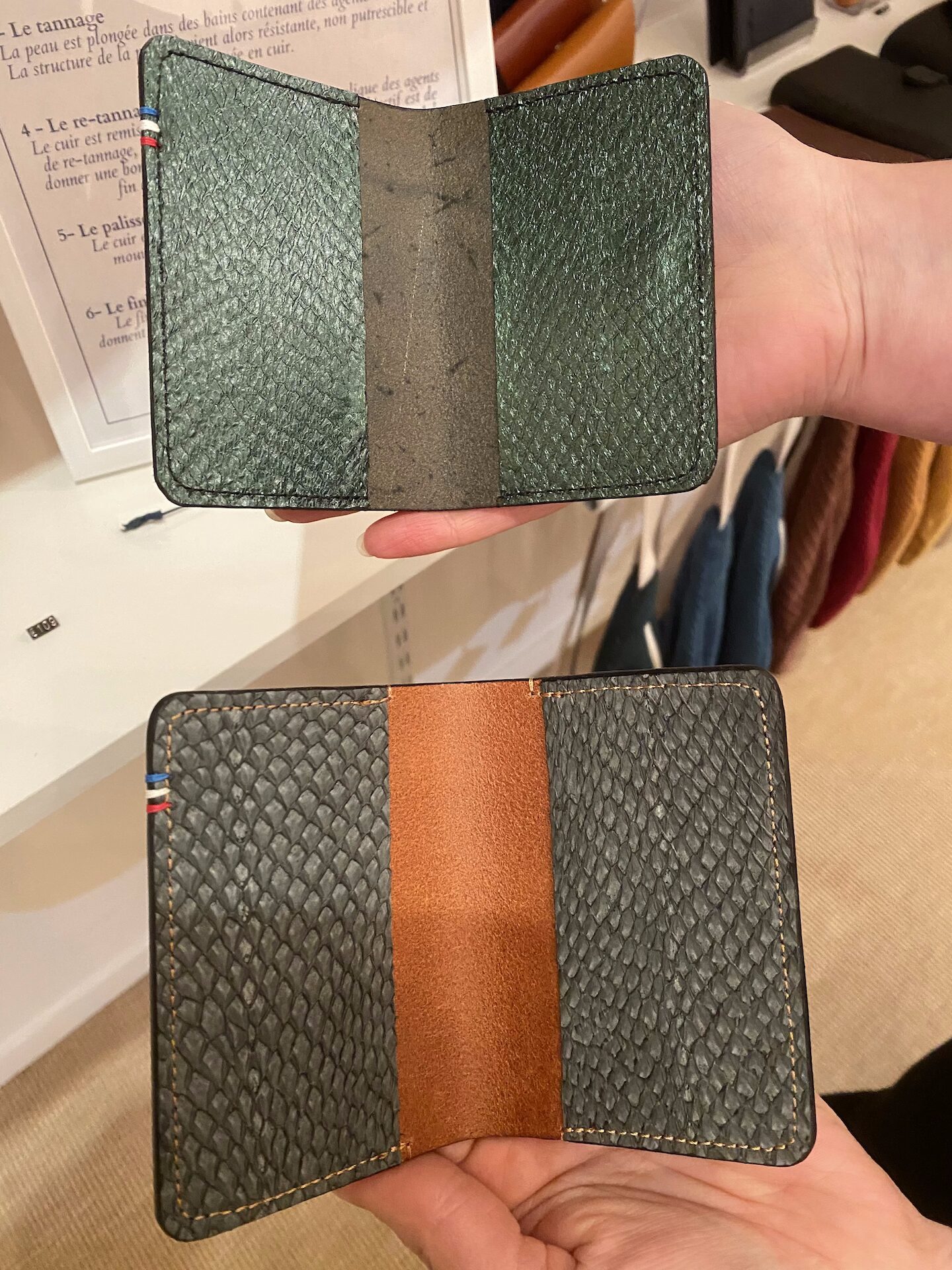 Ils commencent alors à expérimenter, le soir, le week-end, à tester des prototypes. Leur premier objet devient vite un classique de la maison : le porte-cartes en cuir de poisson, à la fois minimaliste et audacieux.