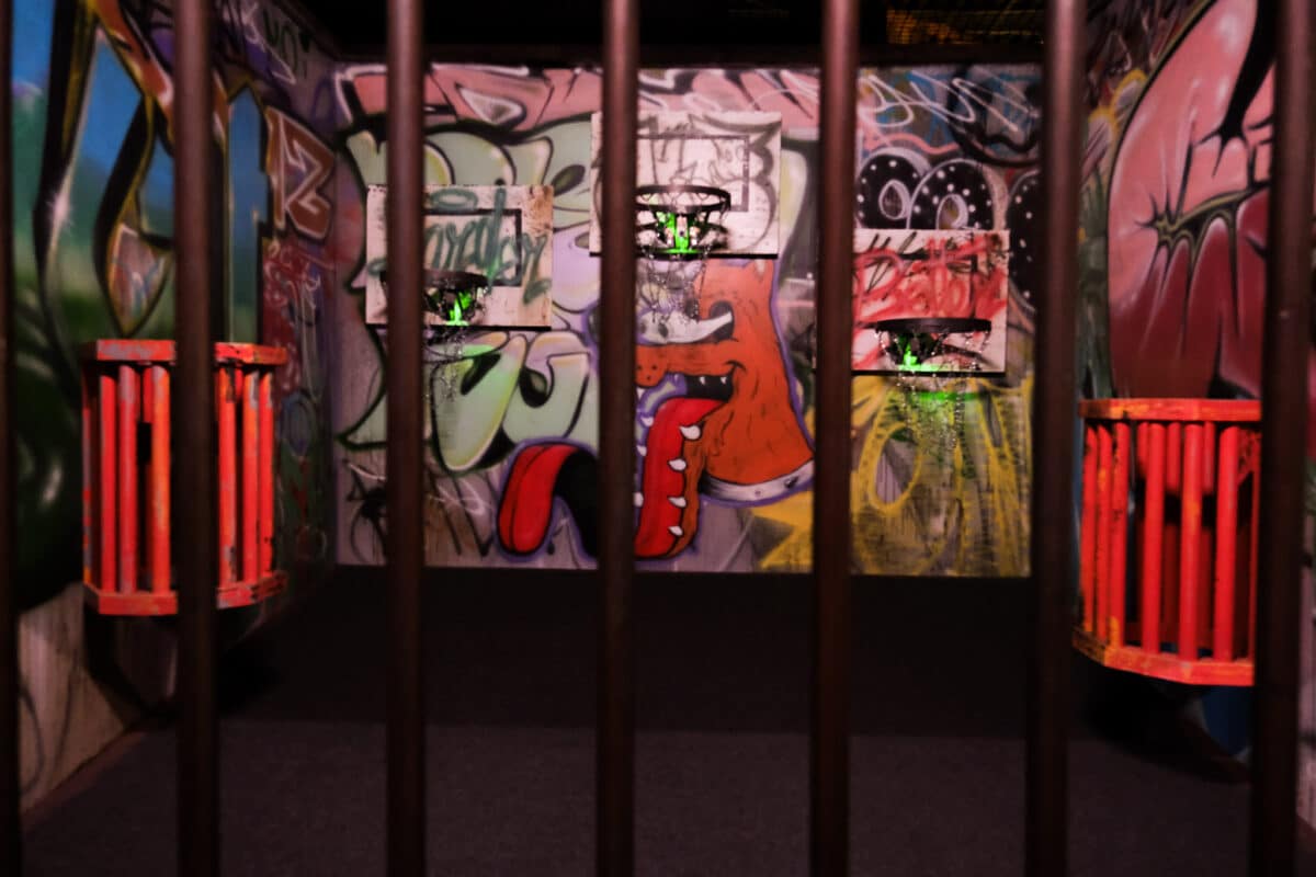 25 cellules s’offrent à nous : quelle approche privilégier ? Faire chaque cellule l’une après l’autre ou opter pour celles dans lesquelles nos compétences brilleront le plus ? Essayons d’abord de voir de quoi nous sommes capables ! La déambulation commence, accompagnée d’une ambiance sonore digne d’un bon film d’action pour nous dynamiser (ou faire monter le stress au choix). Des pancartes sont placées à l’entrée de chaque cellule avec pour seules indications le nombre de personnes recommandé, les niveaux de difficulté tactiques, techniques et physiques de la pièce et le temps que nous avons à l’intérieur avant que ne sonne l’alerte. Une petite phrase donne également un indice quant à ce qu’il se trouve derrière la porte… Il est trop tard pour reculer, ouvrons une première cellule : « Einstein ».
