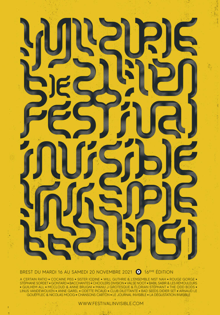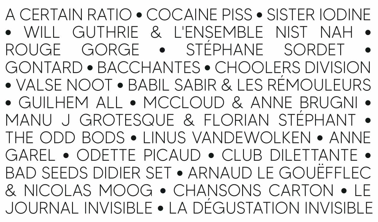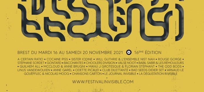 La seizième édition du Festival invisible à Brest, comme l’explique l’artiste Arnaud Le Gouëfflec “effeuille la Chose comme la marguerite du conte : des fées clochettes de Babil Sabir au Grooooove Mortel de A Certain Ratio, ou au business plan dada des Odd Bodds, du phénix Rouge Gorge au saxophone labyrinthique de Stéphane Sordet (Ensemble Sillages), de l’orchestre en bois flotté de Nist-Nah au punk-rock roulette russe de Cocaïne Piss, de la noise forgeronne de Sister Iodine au hip-hop déblastateur de Choolers Division, du jokerfreenoise de Valse Noot aux tubes lapin-duracell de Gontard, jusqu’à la conférence des oiseaux de Bacchantes, les travaux manuels de l’ébéniste industriel Guilhem All ou les très riches heures de Linus Vandewolken, le Johnny B. Goode de l’épinette des Vosges.Cette édition est dédiée à Rémy Talec, infatigable arpenteur de l’underground brestois, qui nous a quittés en novembre 2020, et dont la longue silhouette élastique, familière à notre horizon, restera à jamais notre ombre chinoise.“
