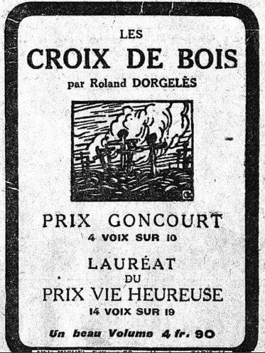 L’éditeur Albin Michel, mauvais perdant, barrera la couverture du livre de Dorgelès d’un bandeau portant en gros caractères « PRIX GONCOURT », suivi d’un minuscule additif, « 4 voix sur 10 ». Gallimard, ayant porté plainte, n’obtiendra le retrait du bandeau auprès des tribunaux que de longs mois plus tard.