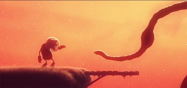 Julien Leconte – L’idée de base est partie de plusieurs choses : je travaillais sur un projet avec Bruno Collet (présent sur le festival pour son court-métrage Mémorable, ndlr) et Benjamin Botella sur des flics de l’espace, un univers réaliste dans un contexte de science-fiction. Le projet n’a finalement pas vu le jour, mais ce décalage m’est longtemps resté en tête. Et d’un autre côté, il y a ce jeu vidéo Limbo, une vraie source d’inspiration graphique. L’ombre chinoise a une vraie profondeur dans ce jeu, ce que je trouve très beau.