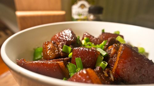 Le plat se sert avec du riz blanc vapeur et quelques tiges de ciboulettes coupées comme sur la photo ci-contre. Ok, je sens que vous vous dîtes que cette photo ne représente pas du porc végétarien ! N’en croyez rien ; la technologie culinaire taiwanaise bouddhiste est très performante.