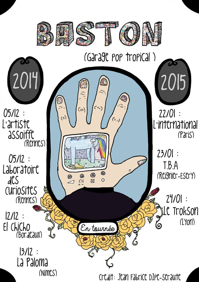 Baston : En vrai, pendant les Trans au Laboratoire des Curiosités (en plus des Bars en trans), le 12 décembre à Bordeaux, le 13 à Nîmes pour le festival Winter Camp, et en janvier à Paris / Reignier / Lyon les 22, 23 et 24. En faux, sur une matière plastique en polychlorure de vinyle lisible à 33 tours/minutes vers avril 2015 sur le label parisien Howlin » Banana Records.