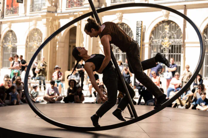 La présence du spectacle Inertie de la Compagnie Underclouds dans deux villes différentes reflète l’ADN du festival : l’itinérance. Tout en mettant en scène deux funambules qui travaillent la roue cyr de manière particulière, autonome : « Cette énorme roue cyr a un axe central qui lui permet de tourner sur elle-même », explique Olivier. « L’acrobate n’a plus besoin de l’animer physiquement pour qu’elle tourne. De petits gestes et pressions la font tourner sur elle même, ce qui permet de pratiquer la roue cyr à plusieurs. » (14 et 15 juin, La Basse Cour, Rennes ; 20 juin, Place Jean Auvergne, Le Rheu)