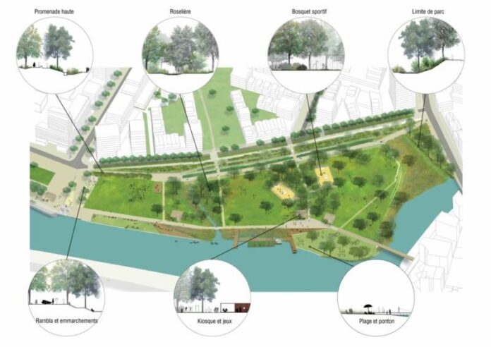 Conçu par Jacqueline Osty, paysagiste associée à Reichen & Robert, urbanistes de la Zac Baud-Chardonnet, le parc, raccordé en 2020 à la rive droite de la Vilaine par une nouvelle liaison piétonne et deux-roues, proposera un vaste espace de convivialité présentant la particularité de répondre en même temps à la nécessité de composer avec l’aléa des crues.