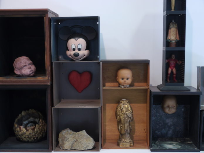 À côté de cette beauté picturale, le visiteur découvre l’énigmatique installation de l’artiste brésilien Kenzi Shiokava ; elle conjugue une série d’œuvres réalisées entre 1990 et 2000. Aux côtés d’objets votifs et d’éléments minéraux et végétaux, un univers se construit autour de Mickey Mouse et autres poupées en plastiques étrangement disposés et classés dans des boites en bois. Un autel où se confrontent la nature et la société de consommation dans un assemblage d’objets trouvés, cassés, et d’éléments naturels récupérés dans son jardin au moment où les plantes commencent à… mourir.