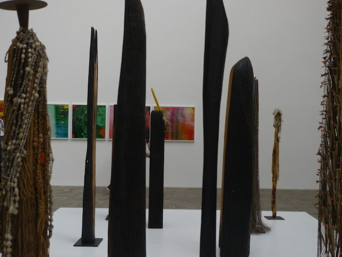 Être accueilli dans le patio par le travail de l’artiste brésilien Kenzi Shiokava (déjà aperçu aux Halles de la Courrouze) retient l’attention du visiteur. La technique traditionnelle de la sculpture sur bois est exposée dans son aspiration à la splendeur et confrontée à des matériaux industriels – traverses de chemin de fer et autres poteaux téléphoniques. Aussi bien en bois qu’en macramé habillé de coquillages, ces figures silencieuses rendent hommage à la vie, à la mort, mais aussi à l’hybridité culturelle, la spiritualité et la renaissance. Tel un jardin de formes aux allures anthropomorphes et totémiques, le visiteur prendra la mesure de chaque détail en tournant autour.