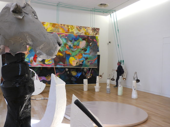 Une tenture murale pour décor, des costumes en papier mâché et des sculptures-instruments pour l’orchestre… composent l’installation Dead pan ham (2018) de Madison Bycroft. Mise en scène étrange et colorée en attente d’être activée. Réalisée pour le Musée des Beaux-Arts de Rennes par l’artiste, elle propose de s’installer sur un tapis circulaire au centre de son œuvre, devenant à la fois spectateur et acteur de l’installation.
