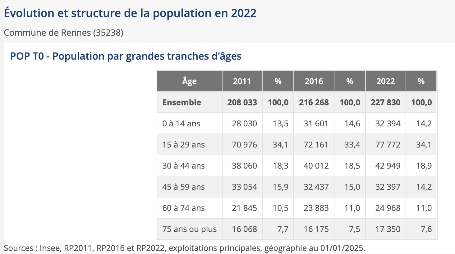 Avec 227 830 habitants en 2022, Rennes connaît une croissance annuelle de +0,9 % depuis 2016, supérieure à la moyenne nationale. Dans son bassin de vie, ce sont plus de 404 500 personnes qui vivent aujourd’hui, marquant une densité de 913 habitants au km², contre 857 en 2016. Ce gain démographique repose à la fois sur un solde naturel positif (+0,5 %) et sur une attractivité migratoire stable (+0,5 %). Autrement dit, Rennes ne vieillit pas — elle rajeunit. Et elle attire.