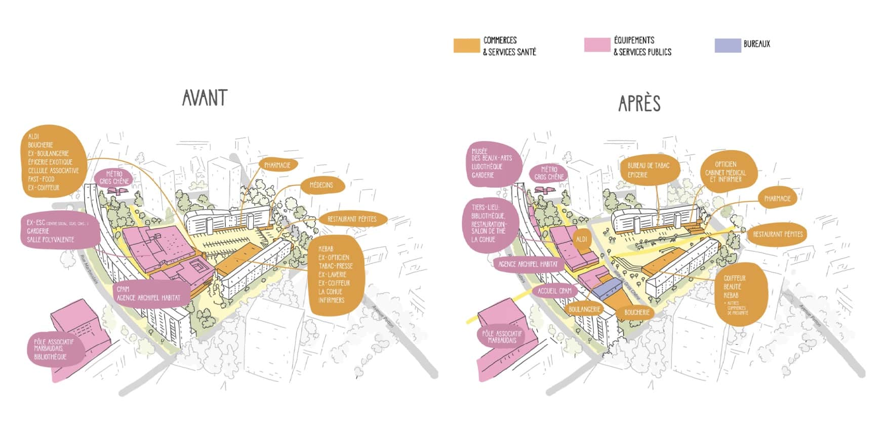 Dans la continuité de l’arrivée de la ligne B du métro dans le quartier Gros-Chêne, la mairie de Rennes souhaite redorer l’image de cette place qui baigne dans son jus depuis l’installation de ses dalles dans les années 1960. Accéder à cette station est actuellement un « parcours du combattant » selon Julien Bailleul, directeur du projet à Territoires Rennes, aménageur de la métropole bretonne. Les espaces publics de la zone commerciale Gros-Chêne feront l’objet d’une requalification d’ampleur afin de la transformer en quartier de vie familiale et « développer une mixité sociale par l’accueil d’une nouvelle population en diversifiant l’offre des logements ».