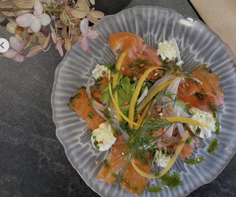 Les Demoiselles, c’est un restaurant d’environ trente couverts, imaginé pour être lumineux, chaleureux, accueillant. La cheffe Angélique Domballe a « reparti de zéro » en entrant dans les murs : vaisselle chinée, meubles choisis pour un esprit vintage et familial, carrelage d’origine conservé, et une teinte terracotta qui réchauffe l’ensemble. Ici, l’élégance ne cherche pas à impressionner : elle rassure, elle enveloppe. En salle, Clémence tient l’accueil « du début à la fin », avec ce mélange de sourire et d’efficacité qui compte beaucoup au plan concret : on se sent attendu, et on n’attend pas trop.