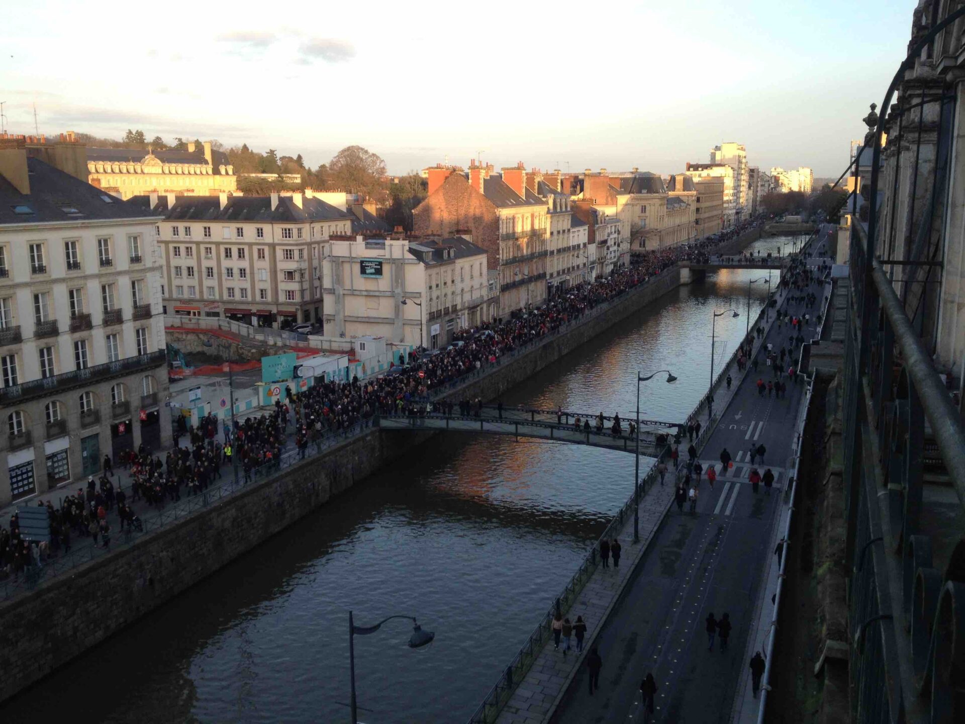 C’est un peu réchauffés par le soleil froid d’un limpide ciel breton que plus de 100.000 (entre 100 et 140.000) habitants de Rennes, du département et de plus loin se sont retrouvés. Dimanche 11 janvier 14h, l’esplanade Général-de-Gaulle se remplit lentement mais sûrement.