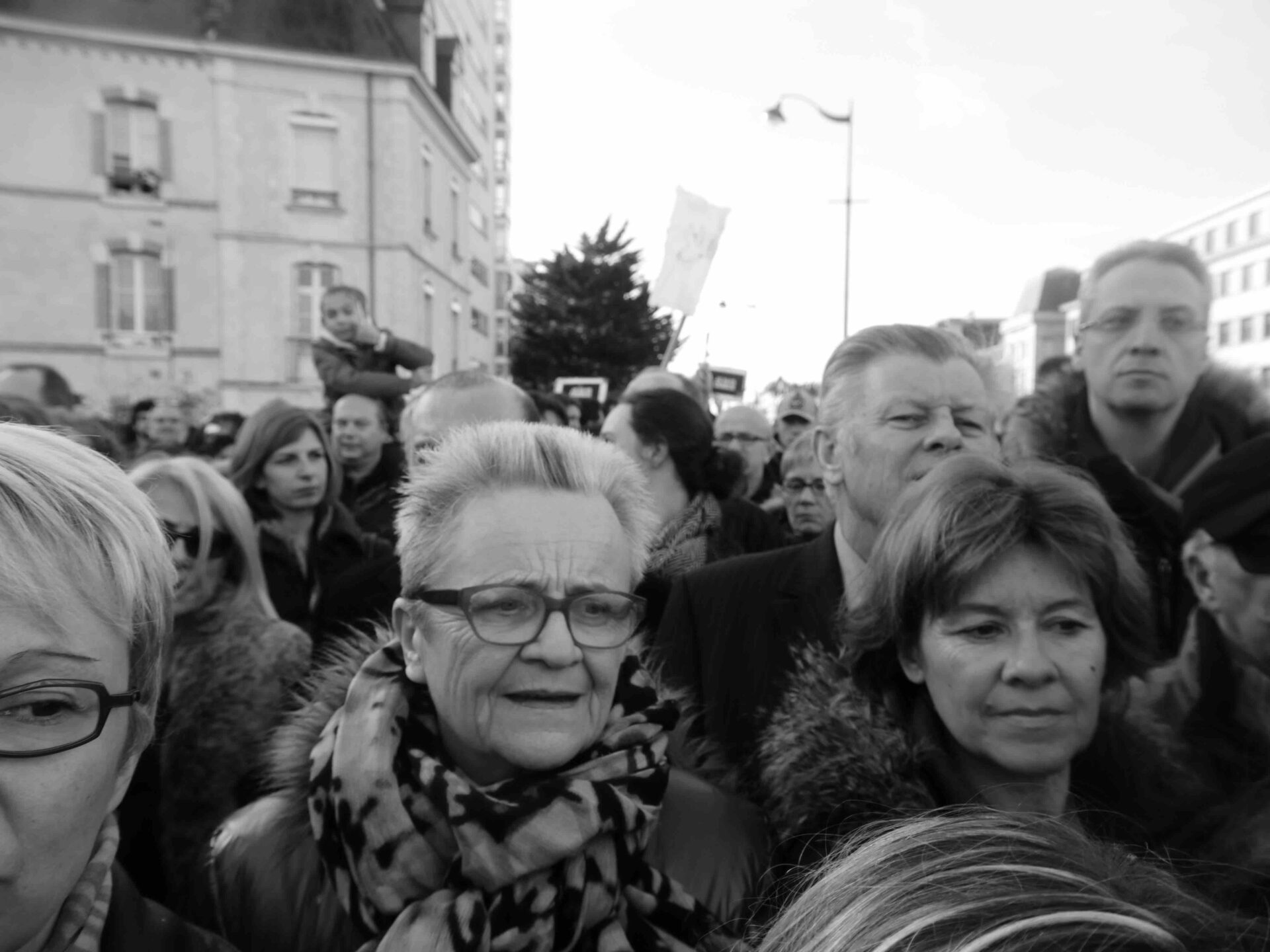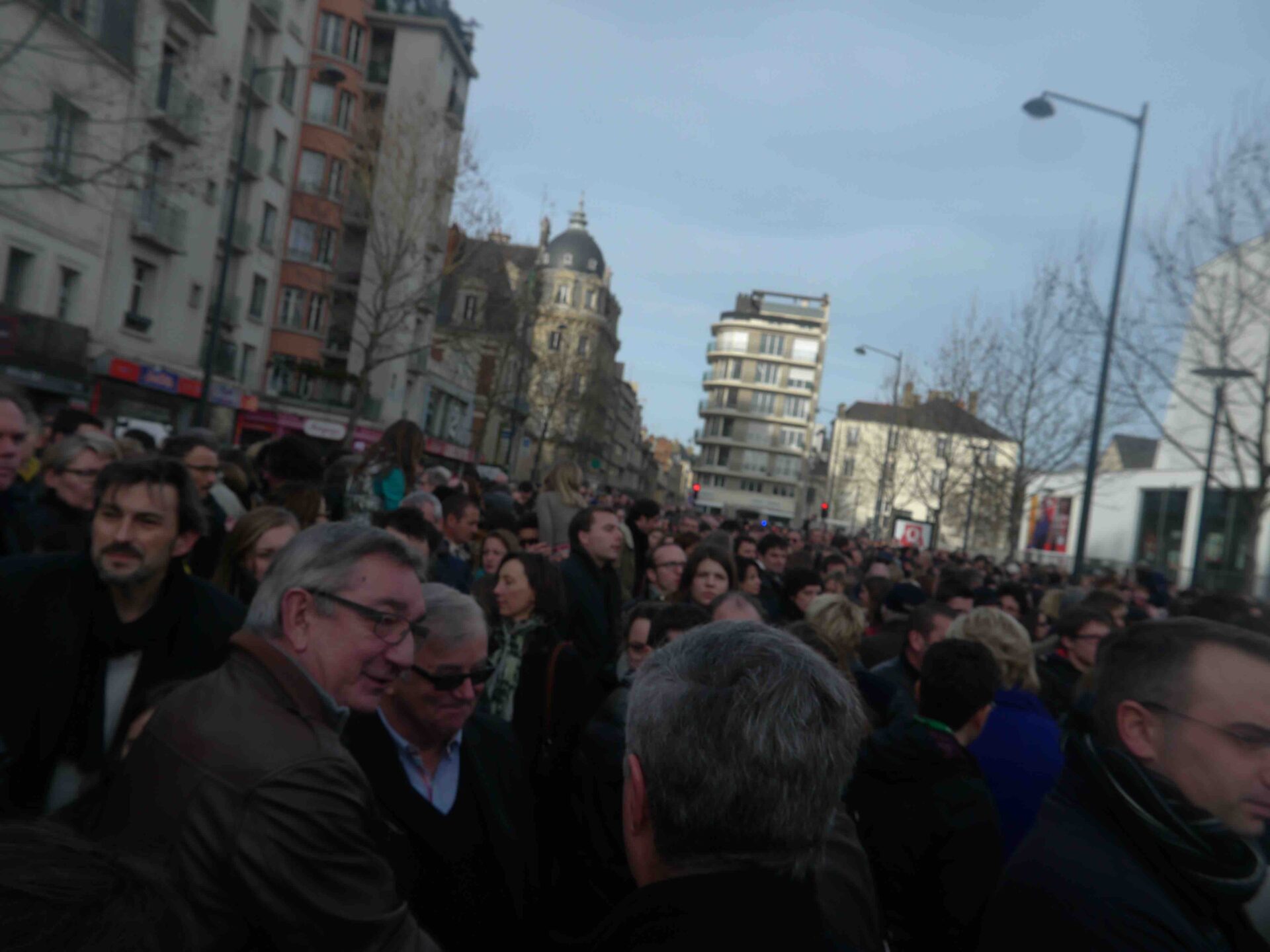 À 15h, une foule immense déborde de la place dans les artères avoisinantes. 15h30, le cortège s’ébranle. Derrière la banderole affirmant haut et fort « nous sommes tous Charlie », plusieurs journalistes se sont glissés devant les représentants administratifs, politiques, associatifs et religieux. Enfants et adultes arborent des dessins, des images, des photos, des couvertures de Charlie Hebdo et le symbole même de cette liberté créatrice bafouée : des crayons.