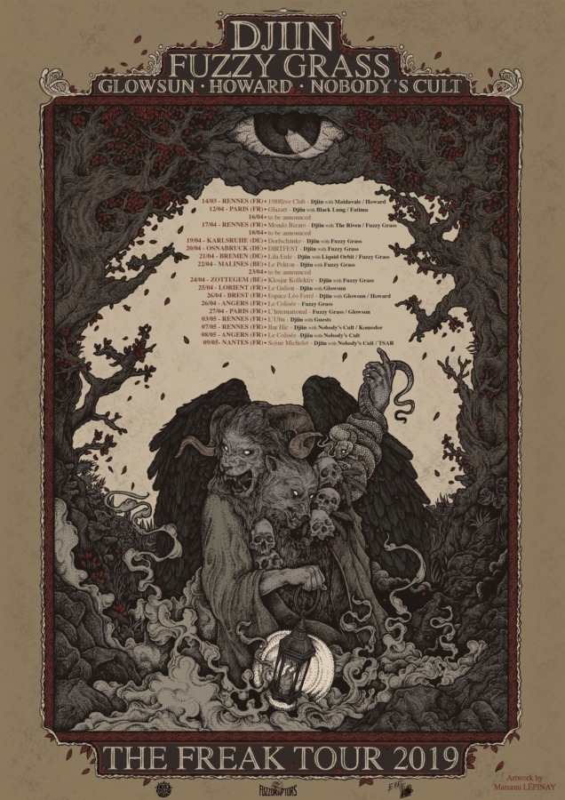 Chloé Panhaleux —On a fait une petite tournée d’essai en France et en Allemagne. Cette expérience était très importante même si c’était beaucoup d’adrénaline et de stress. C’est là que tu sais si un groupe va s’inscrire dans la durée, c’est sur sa capacité à résister à une tournée. On a fait plusieurs dates avec d’autres groupes comme Glowsun ou Howard et surtout Fuzzy Grass, avec qui ça a bien accroché. On fait d’ailleurs la majorité de notre prochaine tournée avec eux. Ça nous a permis d’avancer, car le stoner-psyché est un petit réseau. On est partis assez tôt à l’étranger et surtout en Allemagne. C’est très lié à ma vie et je voulais absolument y emmener Djiin là-bas. Maintenant ce n’est pas terminé, on va en faire une autre à partir du 14 mars jusqu’au 9 mai toujours en France et en Allemagne, mais aussi en Belgique.