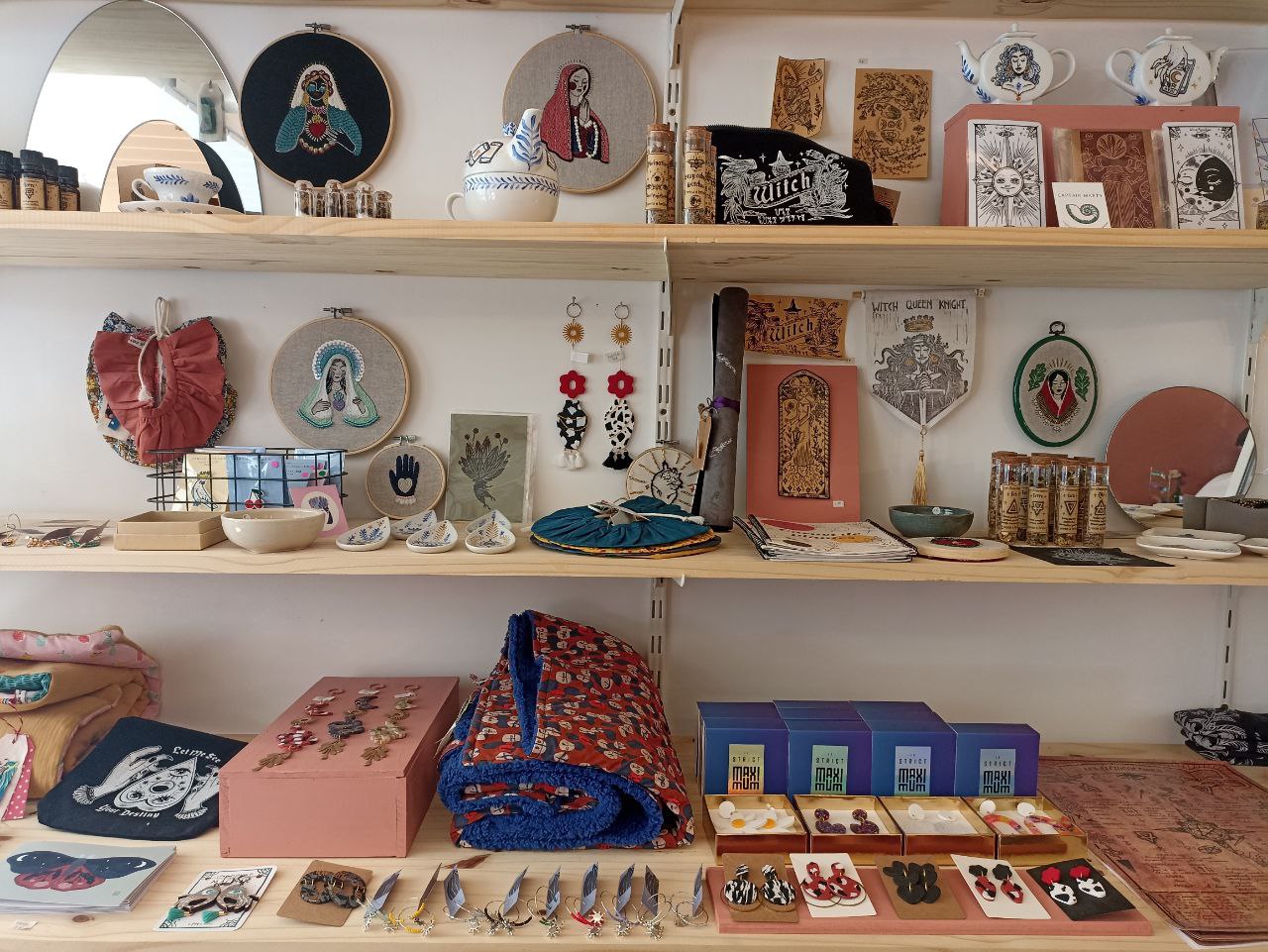 Installée du côté de Lyon, la créatrice Wildfolksoul gâte l’espace de ses bougies illustrées, ses autocollants et ses petites pochettes sérigraphiées pour révéler la sorcière qui est en toi ! De petites fioles contenant des encens en grains faits maison attendent aussi patiemment sur les étagères blanches de l’espace corner. Les encens ont été créés par ses soins à l’aide d’ouvrages de référence sur les correspondances entre chaque élément. « Ils sont à base d’épices broyées et de plantes fraîches sélectionnées, séchées et consacrées par mes soins ainsi que de la résine d’encens bio », lit-on sur le site de la créatrice.