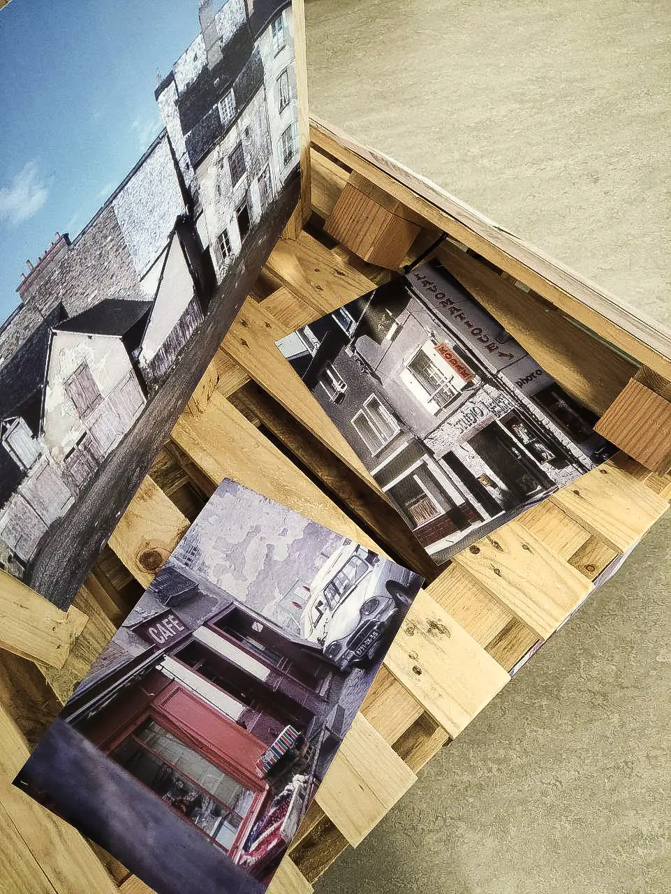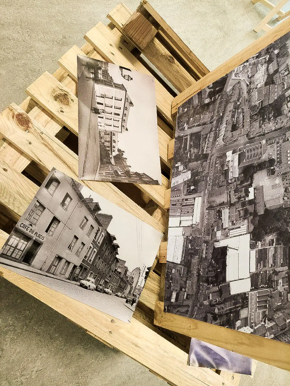 Sur un mur, des vues aériennes côtoient des photographies d’habitants, de bâtiments ou de commerces qui ont façonné le quartier. On reconnaît notamment une des façades de l’ancien Cinéville habillée d’une oeuvre réalisée dans le cadre de Teenage Kicks, biennale d’art urbain. On devine aussi l’intérieur du café le Cortina, ancien Café des Côtes du Nord dont on découvre la façade un peu plus loin sur une photo en noir et blanc… À la recherche du Colombier est le résultat d’une résidence qui s’est étalée sur deux saisons. L’artiste propose aujourd’hui un voyage entre patrimoine, urbanisme et récits personnels de ce territoire perçu comme un véritable labyrinthe.