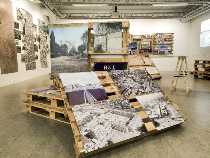 Dans la salle d’exposition du centre culturel Le Phakt, la photographie comme médium principale construit la scénographie et raconte le territoire qui abrite le lieu. Des clichés en noir et blanc ou en couleurs habitent des îlots de palettes tandis que les murs blancs en sont recouverts. Tous ont en commun l’histoire et l’identité du quartier Colombier à Rennes, emblématique des années 1970. L’exposition À la recherche du Colombier invite à redécouvrir ces espaces urbains à travers le regard d’Adrien Lecoursonnais, médiateur du patrimoine et artiste urbain natif du quartier.