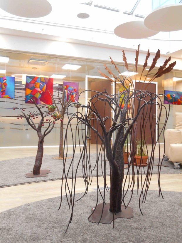 Les deux artistes confient que le montage de l’exposition s’est fait tout simplement. Le sculpteur a créé un jardin aux allures féériques et poétiques : entre saule pleureur et arbre à nuages… De toutes tailles, des arbres en acier se dressent dans l’espace lounge, à la fois immobiles et comme vivants. Le premier de la collection ouvre le chemin : un bonsaï aux racines imposantes. Sur les murs, les peintures de Marie-Pierre Jan rehaussent le 18 Quai de ses traits. Les deux pratiques artistiques se font face, se croisent et se retrouvent dans un point commun : l’arbre. L’arbre, présent dans chaque coup de couteau qui crée la peinture comme dans chaque maniement de l’acier qui construit la sculpture.